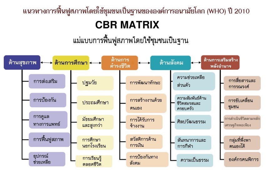 การใช้กรอบแนวคิดของการดูแลที่สมบูรณ์แบบครอบคุลม 5 ด้าน ได้แก่ (1) ด้านการดูแลสุขภาพ (Health) จะต้องมีการส่งเสริม การป้องกัน การดูแลทางการแพทย์ การฟื้นฟูสภาพ และดูแลอุปกรณ์การช่วยเหลือต่าง ๆ ที่ผู้ป่วยควรได้รับ เช่น อุปกรณ์การช่วยฟังในผู้ป่วยมีปัญหาเรื่องการได้ยิน อุปกรณ์การช่วยฝึกพูด เป็นต้น (2)สนับสนุนให้ผู้ป่วยได้รับการศึกษา (Education) ที่สมวัยตามเกณฑ์การศึกษาขั้นพื้นฐาน ในระดับประถม มัธยมศึกษา หรือสูงกว่า การศึกษานอกโรงเรียน และการเรียนรู้ตลอดชีวิต ตามระดับสติปัญญาโดยการประเมินพัฒนาการและไอคิวร่วมด้วย (3) ด้านดำรงชีวิต (Livelihood) สนับสนุนให้มีการพัฒนาทักษะ การสร้างงานด้วยตนเอง การได้รับการจ้างงาน สวัสดิการด้านการเงิน และการป้องกันทางสังคม โดยจัดกิจกรรมเพื่อให้ผู้ป่วยได้รับการพัฒนาทักษะที่จำเป็น ให้สามารถเข้าถึงแหล่งช่วยเหลือต่าง ๆ และดำรงชีวิตอยู่ในสังคมอย่างเท่าเทียมได้ (4) ส่วนด้านสังคม (Social) ควรมีการสนับสนุนจิตสาธารณะในการช่วยเหลือคนอื่นหรือตอบแทนคืนสังคม ความสัมพันธ์ด้านชีวิตสมรสและครอบครัว ด้านศิลปวัฒนธรรม สันทนาการและการกีฬา และการได้รับความเป็นธรรม สิ่งที่กล่าวมานี้หากผู้ป่วยได้รับการสนับสนุนทางสังคมที่ดี จะทำให้ใช้ชีวิตได้เหมือนคนปกติทั่วไป (5) สำหรับด้านการเสริมพลังอำนาจ (Empowerment) ต้องสนับสนุนให้มีการสื่อสารและการรณรงค์ การขับเคลื่อนชุมชน การดำเนินชีวิตตามหลักเศรษฐกิจพอเพียง กลุ่มพึ่งพาตนเอง และองค์กรคนพิการ เพื่อให้ผู้ป่วยมีศักยภาพและมีพลังในการขับเคลื่อน และแสดงออกทางสังคมกับชุมชนได้